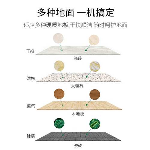 150℃高温蒸汽,快速去除地面上的细菌,还原洁净的居家环境。采用尼龙螺旋复合拖布,去污更强劲。