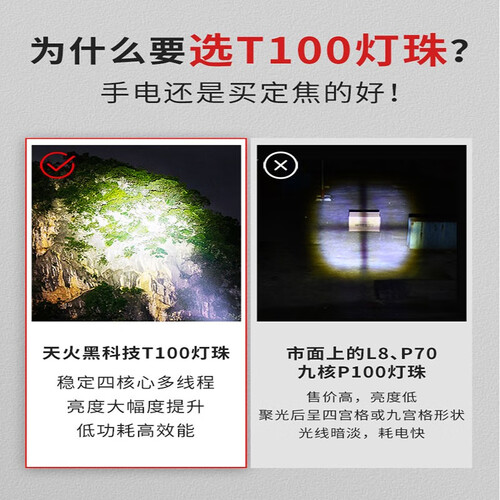 采用天火黑科技T100灯珠,四核心多线程,亮度大幅提升,同时更低功耗,适合登山、露营、骑行、居家等场景使用。