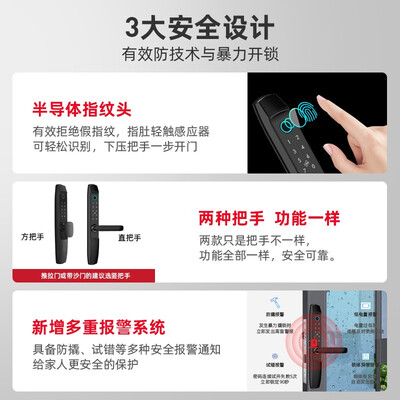 钢化玻璃面板,不仅质地坚硬,且更加耐磨,长久使用不易坏。半导体指纹头,有效防止指纹被复制,增加安全性。