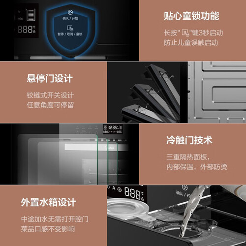 蒸烤箱顶部特别加装加热管,防止蒸汽冷凝,避免滴水对食材口感造成影响。水箱采用独立设计,烹饪途中可随时加水。