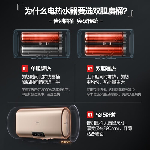双管双胆设计,适应性更强,可满足一人至多人使用,减少能源浪费。24小时预约加热,上班设定,下班即可享受热水。