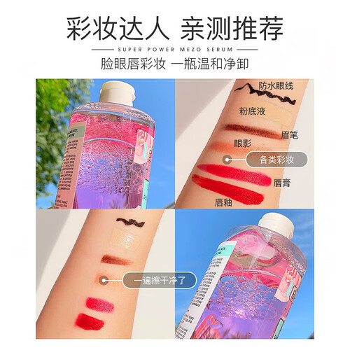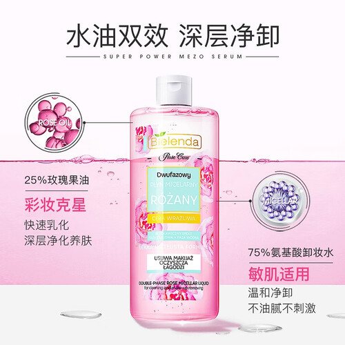 结合氨基酸表活成分,迅速带走彩妆污垢,清洁能力加乘。卸妆水中含有25%的玫瑰果油,以油溶油的原理,可以轻松溶解面部彩妆。