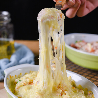 拉丝绵长,吃起来浓郁香醇的芝士碎,它选用新西兰进口干酪制作,奶味浓郁,而且入口软糯细腻,轻松就能拉丝,芝士味很浓。