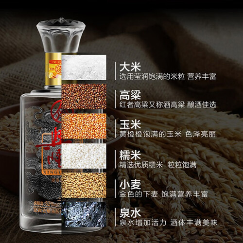 精选高粱大米糯米小麦玉米等纯粮,突出匠心白酒风格。酒色清澈酒体细腻丰满,酒味悠长怡人,不辣喉不上头,香气四溢。