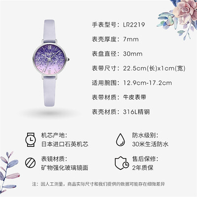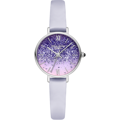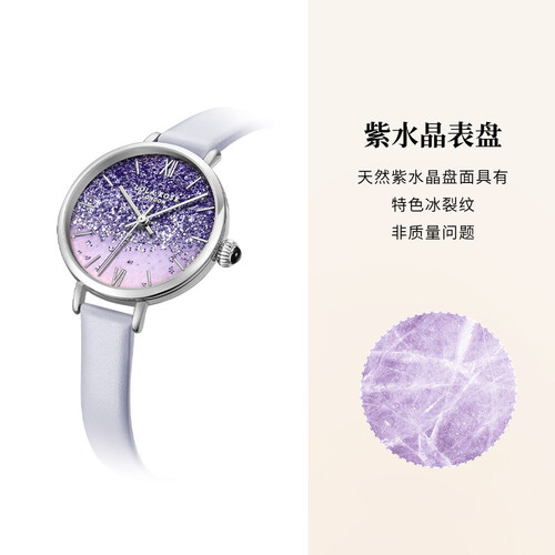 闪片与紫色水晶相互融合,具有多层次的叠加效果,星光闪烁。表冠采用黑色玛瑙装饰,散发迷人的光泽,便捷实用。