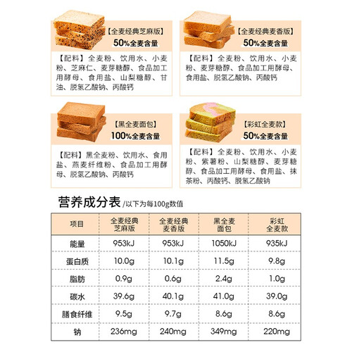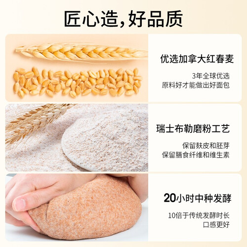整粒小麦研磨,高纤低脂,无糖无油,呈现了食材天然的味道。搭配蔬菜、煎蛋和奶酪做成三明治,会吃得更舒爽。