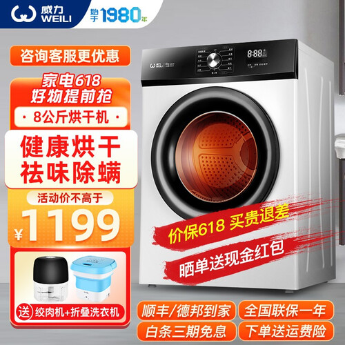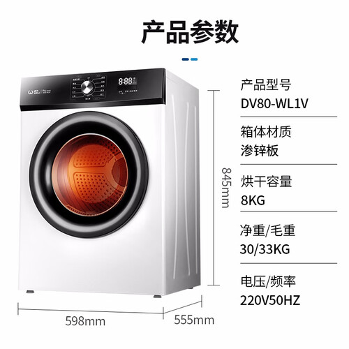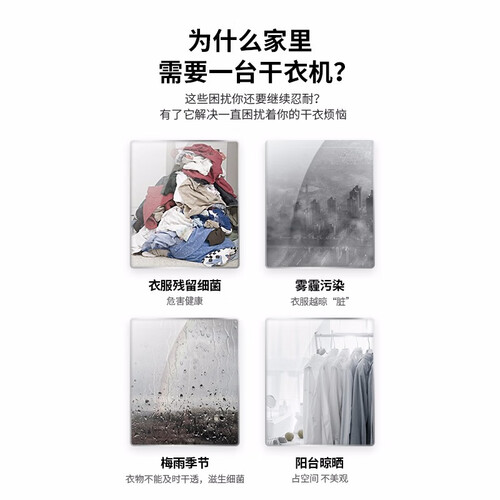 8公斤大容量,大件衣物也能轻松烘干,省心省事。65°C高温持续烘干,去除衣物纤维的有害菌群、螨虫等,呵护健康穿衣。