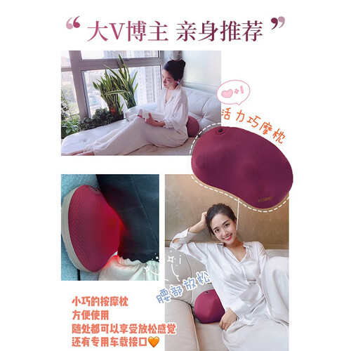 小巧便携,特别设计专用车载接口,随时随地享受按摩时光。参考人体工程力学原理设计,更加贴合腰背,给予深度全面放松。