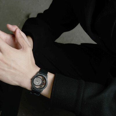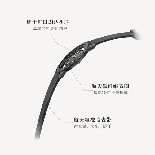 表壳采用碳纤维材料,质量轻松强度高,无惧磨损。表盘采用火箭和月球灵感,搭配镂空设计,让你体验未来感的空间站。