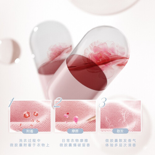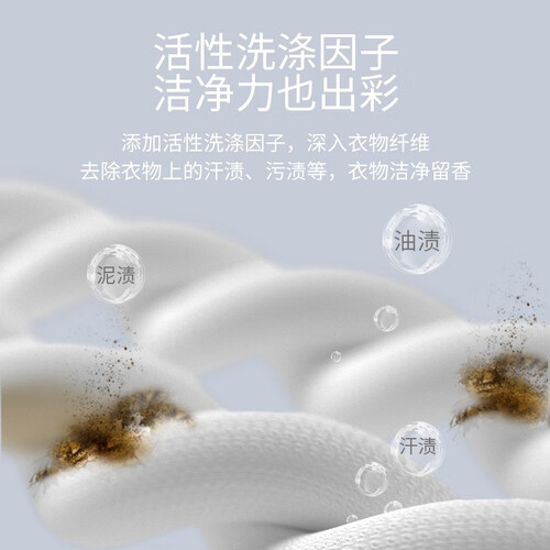 采用微胶囊留香技术,实现衣物摩擦生香,香味绵长且持久;活性洗涤因子,深入衣物纤维,去除衣物上的汗渍、污渍等,洁净还留香。