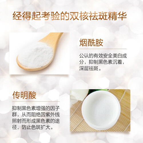 添加烟酰胺精粹,能够焕亮肤色改善暗沉,打造皙白透亮美肌。草本精粹,温和亲肤不刺激,内外兼修肌肤光感通透。
