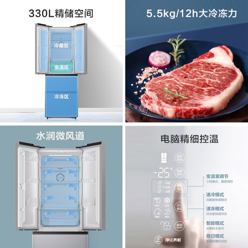 母婴专属空间,食品级的抗菌材料,更健康。冰箱中有智能化霜设计,让水汽随着风道一起循环,不用手动除霜。