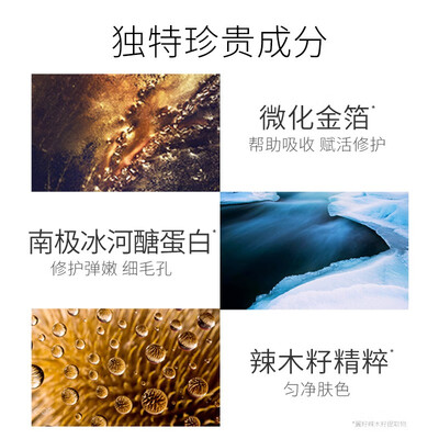蕴含可溶性珍贵金箔,焕活细胞活力,重拾紧实好状态。添加南极冰河醣蛋白,无惧恶劣环境,重拾弹嫩细毛孔。
