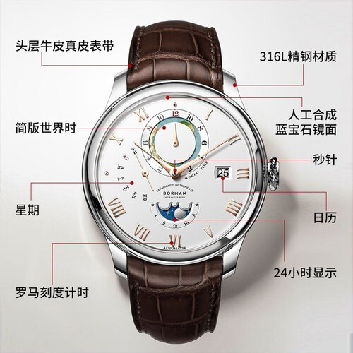 表壳采用316L精钢材质打造,经过双重打磨工艺处理,久用不易褪色。50米防水功能实用性强,无惧水花侵袭。