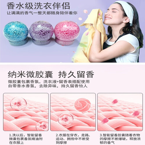 采用纳米微胶囊成分,入水清洗时,智能留香微囊包裹香氛精油附着在衣服上。随着衣物的不断摩擦,释放清新使衣物留香更持久。