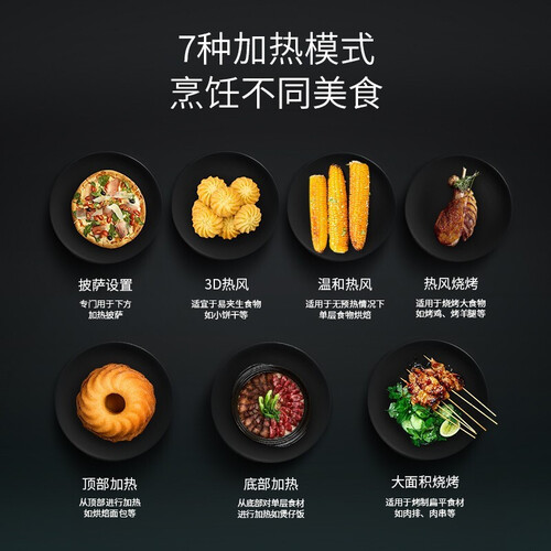 搭配快速预热功能,放入食物之前加热烤箱内部,均匀受热格外香。3D热风立体式循环,各个维度加热食物,美食快速形成。
