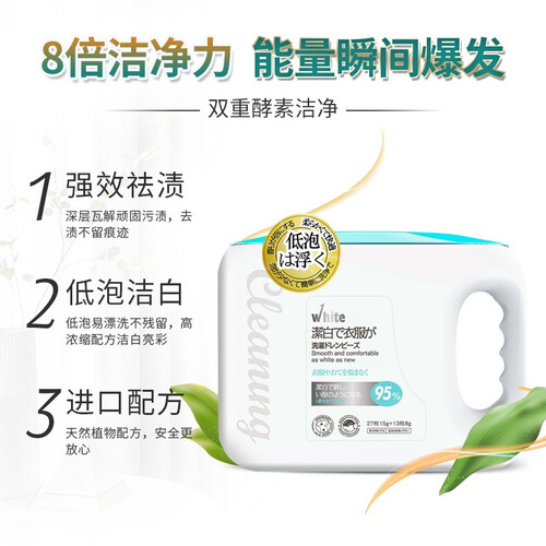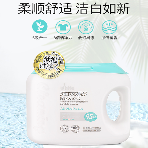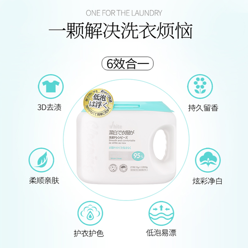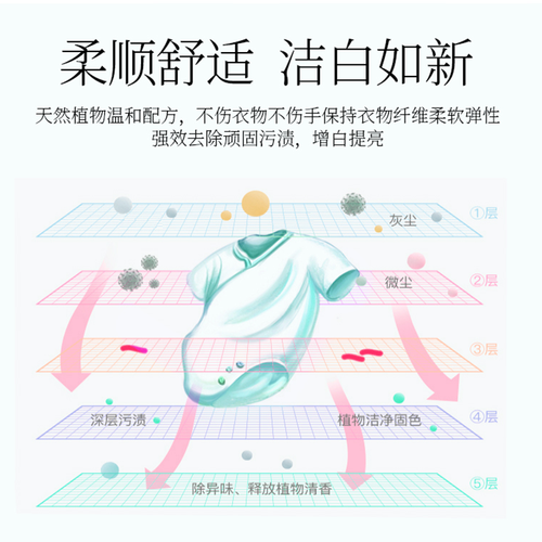 具有六效合一的配方,有效清强劲的清洁力,3D去渍和柔顺护衣护色等,洗衣省时省心。蕴含多种表面活性剂,有效清除顽固污渍。