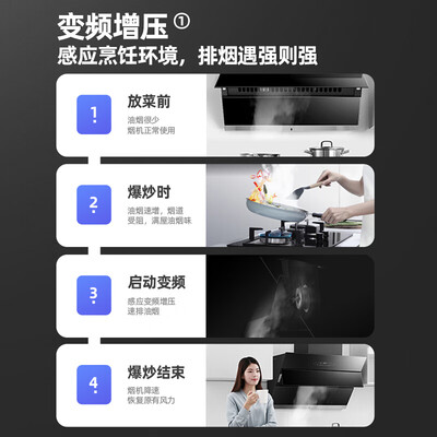 变频瞬吸技术,吸力强劲,爆炒油烟也能快速排出,室内空气清新舒适。宽屏拢烟腔,大面积有效锁住油烟,省心实用。