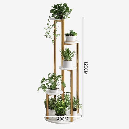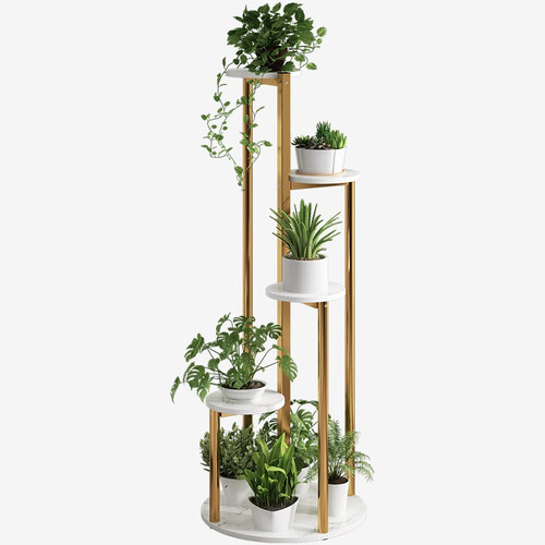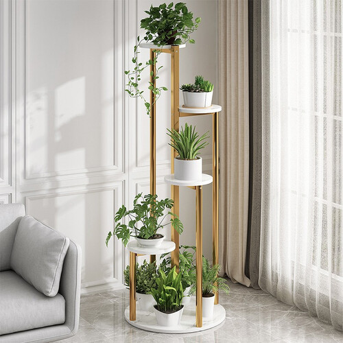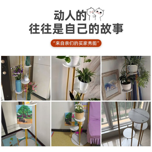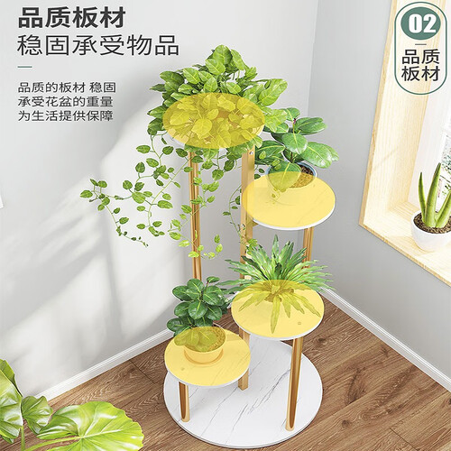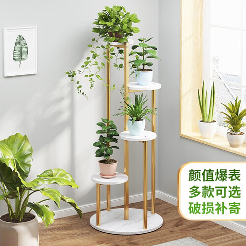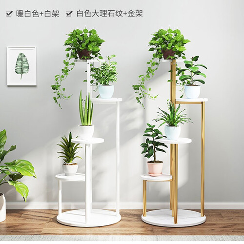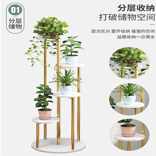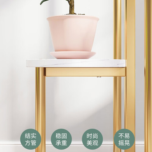 大理石具有较好的承重能力,纹理自然,久用不易开裂,与金色的方管相搭配,更加美观。花架错落有致,放上绿植后更加美观。
