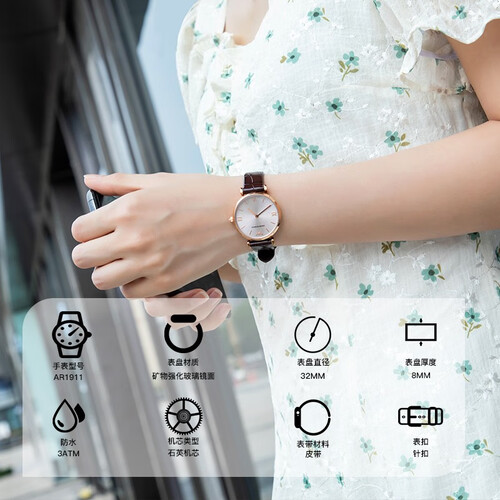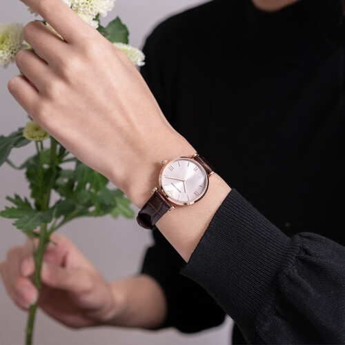 放射纹盘面呈现,搭配镀金指针刻度,增添时尚气息。小巧圆形表壳设计,多重电镀工艺,防止氧化褪色。