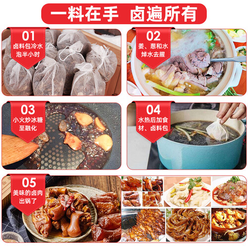 秘制卤料包,可以卤鸡鸭肉,烧红烧肉一卤多用,味道鲜美,口感好。自带无纺布袋,独立包装设计,使用更便捷。