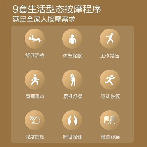 按摩椅内置9套自动按摩程序,舒展活络、休憩促眠、工作减压、肩颈重点、深度指压等供你自由选择,满足生活中的不同需求。