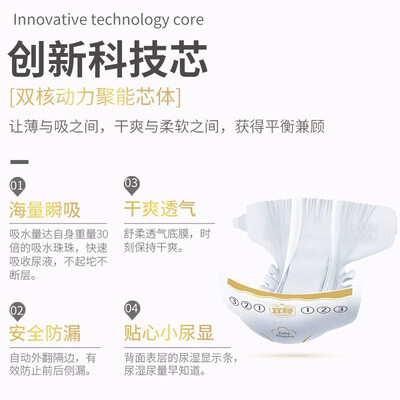 双核动力聚能芯体,即兼顾了轻薄性,吸水性也十分强劲,保持干爽柔软。智能定位点贴,即使是新手妈妈也可轻松穿好。