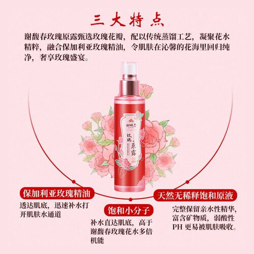 甄选玫瑰花瓣,配以传统蒸馏工艺,凝聚花水精粹,融合保加利亚玫瑰精油,令肌肤在沁馨的花海里回归纯净。