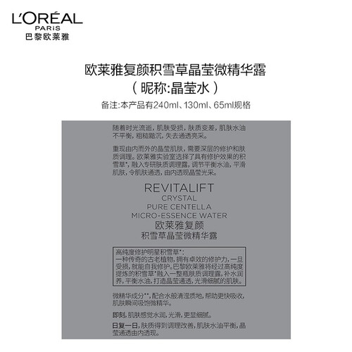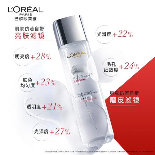 渗透力强的晶莹水,蕴含积雪草等成分,直达肌底深入修护,促进新生角质再生,平衡水油隐匿细纹,提升肌肤的光滑感和透明度。