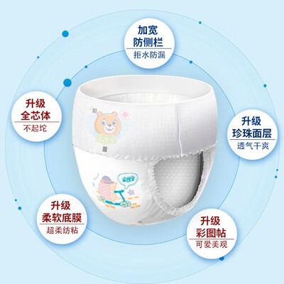 加宽防侧栏设计,有效防止侧漏,使用更放心。升级柔软底膜,绵柔质地,让宝宝更舒服。升级彩图帖,外观可爱,宝宝更喜欢。
