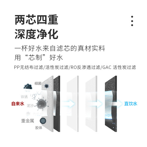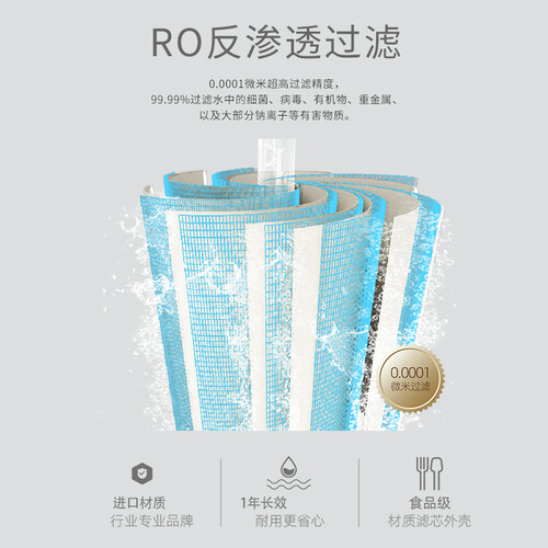 采用RO反渗透过滤系统,过滤精度高,减少重金属、有机物的残留。采用集成水路,没有内置水箱,喝出鲜活好水。