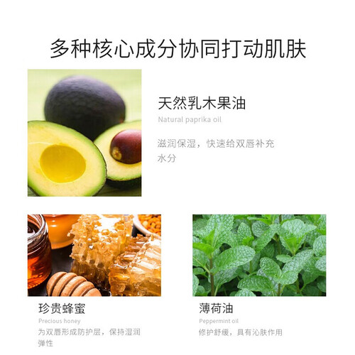 内里含有薄荷清凉成分,减缓唇部干裂带来的痛楚,呵护双唇健康。使用多重保湿配方,长效保湿润养,令其自然弹润。