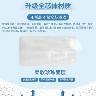 柔软的无纺布面料,防止尿液渗漏,透气不闷热。珍珠结构的表层,给宝宝带来干净卫生的体验。全芯体,更快吸收不起坨。