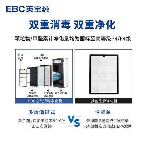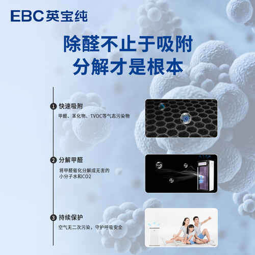 EBC消毒除菌滤网+紫外光触媒,强力消除细菌病毒,将甲醛有效分解,高达99.9%的除菌率,F4级甲醛CCM,无二次污染。