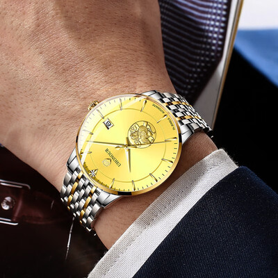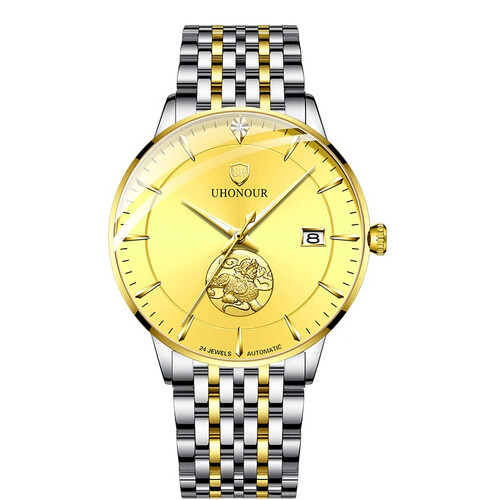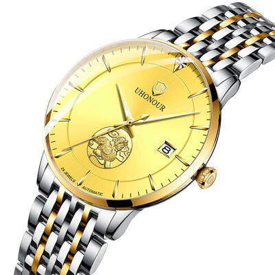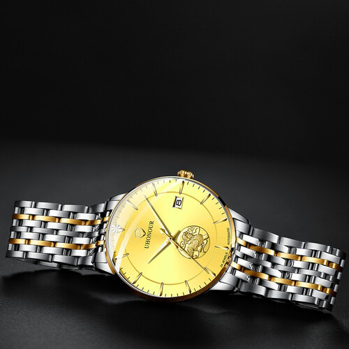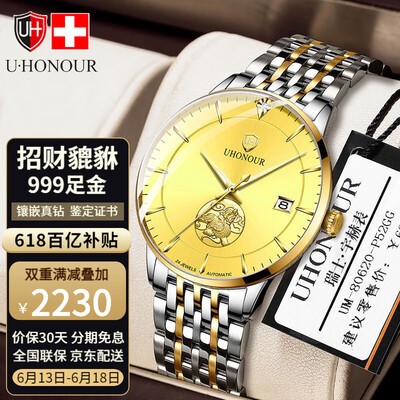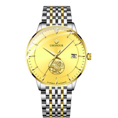 大气的金色表盘,配以貔貅图案,彰显你的不凡品位。表带采用了撞色设计,增强视觉吸引力。