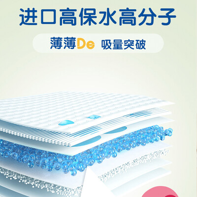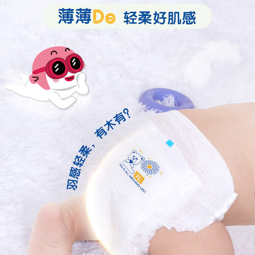 芯体内置进口高保水高分子材料,能紧锁尿液,防止反渗。羽感超蓬松表层,轻柔舒适,呵护幼嫩肌肤。