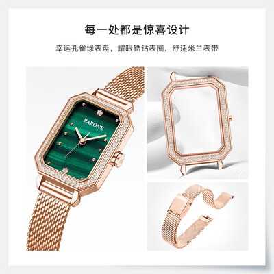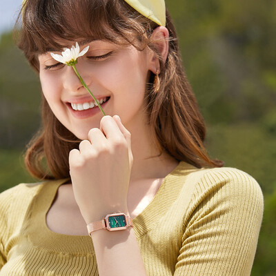独特的方形表盘,设计有创意,作为礼品送给女友更能打动她的心。而且孔雀绿宝石表盘也很有寓意,为你的女友带去更多幸运。