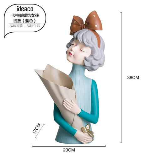 整体颜色以蓝色为主,造型为戴着蝴蝶结捧花的少女,看起来清新又有活力;有着招财纳福的寓意,表达对人们的美好祝愿。