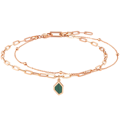 链身主体以型格链条和俏皮的小圆珠为主,双层叠戴设计,时尚大方。搭配不规则设计的孔雀石,给人高贵的感觉。
