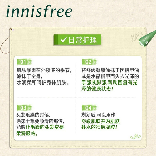 含有丰富的济州芦荟提取物,能够为肌肤密集补水,缓解干燥起皮的问题。加入积雪草成分,补水的同时形成保湿膜,帮助锁住水分。