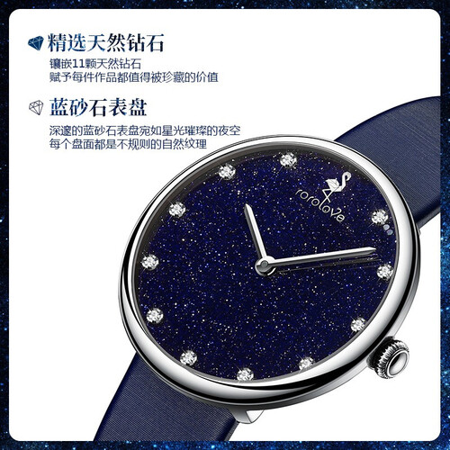盘面为不规则的自然纹理,与11颗天然钻石结合,绽放夺目光彩。采用珍贵的蓝砂石制作镜面,通透性好,方便观察时间。