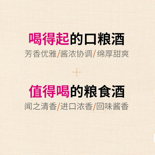 纯粮固态发酵白酒,值得品尝的粮食酒。集茅台酱香、泸州老窖浓香、汾酒清香于一体。酒质清澈,酱浓协调,醇甜爽厚。
