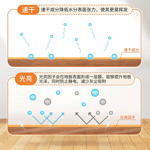 添加光亮快干因子,能让地板快速干燥,有效减少水渍残留,保持地板光亮如新。一次拖抹就可以轻松清洁,十分方便。