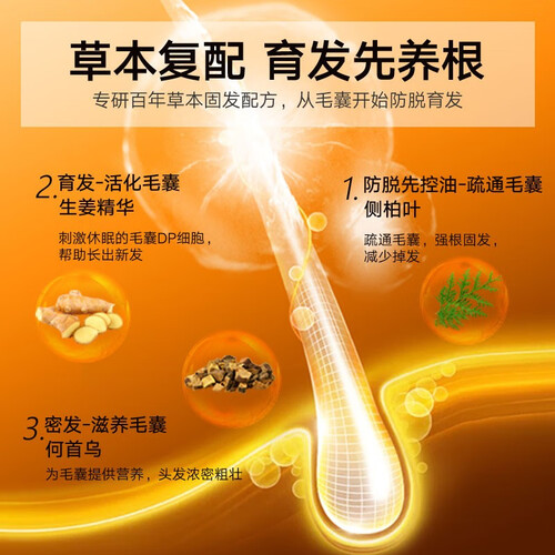 精选山东老黄姜,严格选材精心配比,促进头皮微循环,焕活毛囊从头皮根源解决掉发问题。4重草本复配,强根健发,重现丰盈秀发。