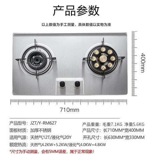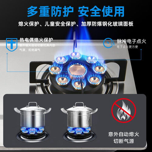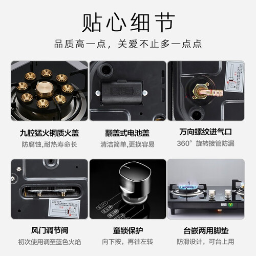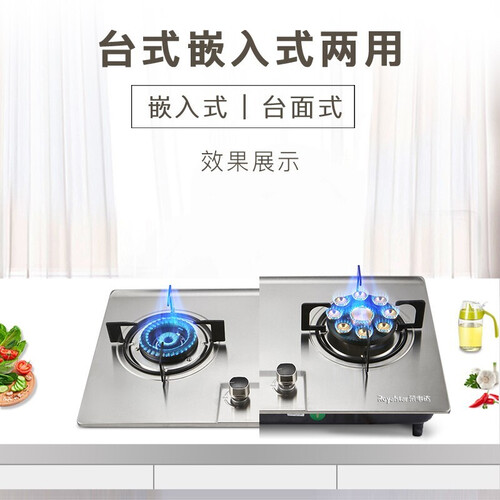 两种安装方式设计,可灵活选择更方便。面板加厚处理,整灶更坚固结实,同时耐用性也得到提升。右灶九腔设计,出火更迅猛。