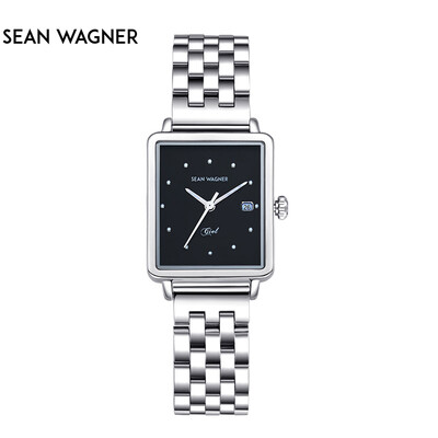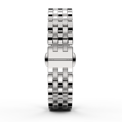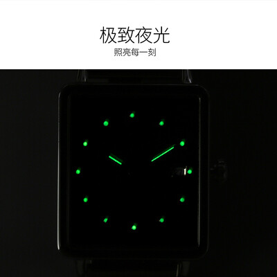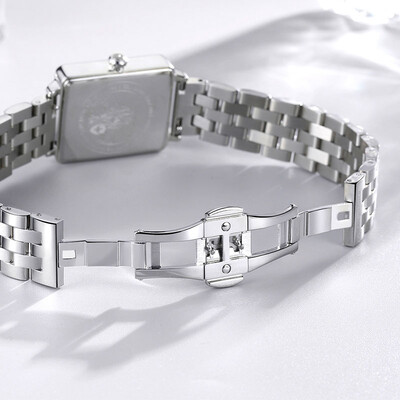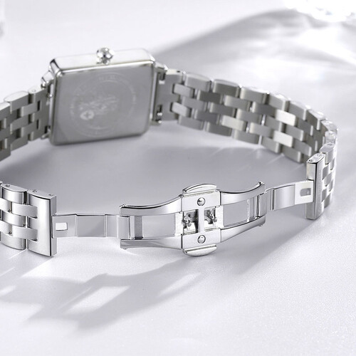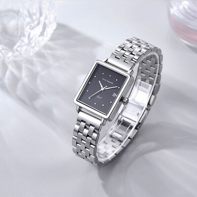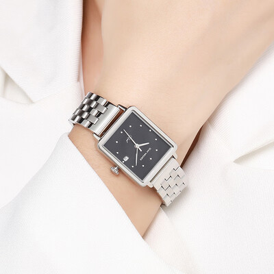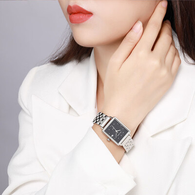 方形表盘设计,黑色基调搭配夜光指针和时标,清晰直观读时,搭配银色精钢材质表带,风格低调复古,衬显优雅知性气质。