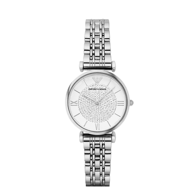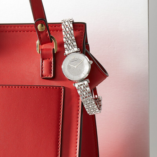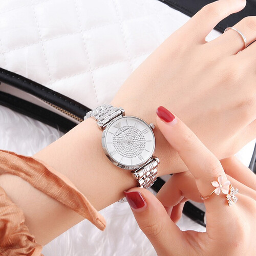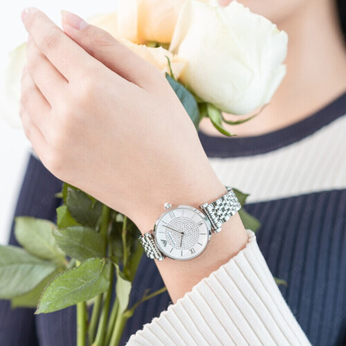 白色的表盘中间群镶了钻石,呈现出满天星般的璀璨光泽,彰显出女神优雅的气质。采用不锈钢表带,色泽质感历久弥新。