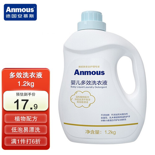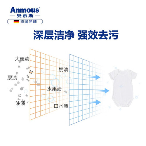 温和植物配方,清洁高效无残留,更加适合宝宝衣物洁净使用。加入了织物护色技术,稳定护色,有效避免衣服串色问题发生。