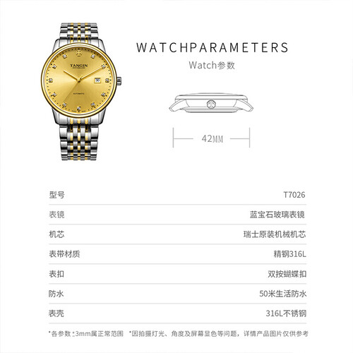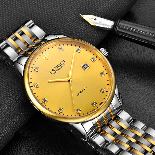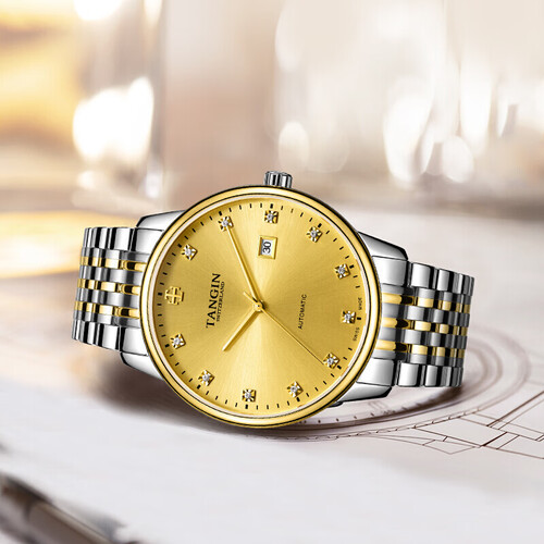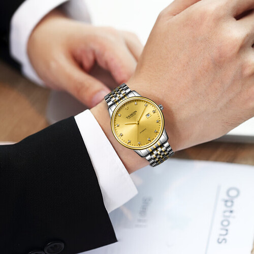 金属拉丝的表盘设计,带着独特的光泽质感,搭配镶嵌的时间刻度,有着璀璨的时尚感,间金色的表带设计,尽显男士品味。