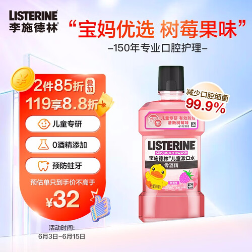树莓口味,甜甜的,孩子漱口更有乐趣。清洁牙齿,有效预防牙菌斑生成,长期使用牙齿更稳固。预防蛀牙,降低牙齿脱落的机率。